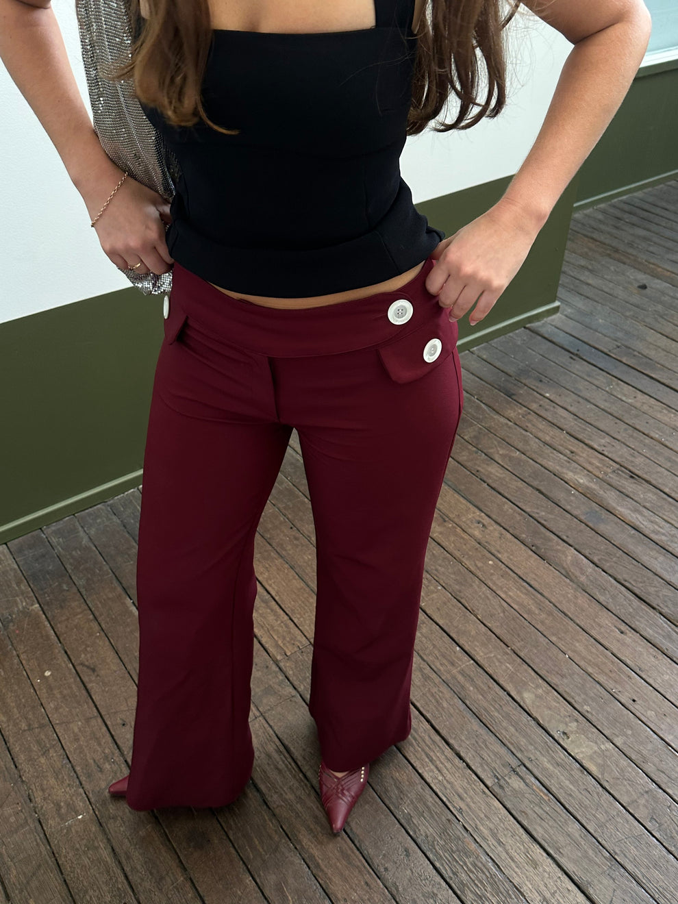 Your new favourite pants. The perfect silhouette that marries a fitted suit pant and a trouser. Mid to low waist with a structured waistband. Italian buttons. Flared leg.